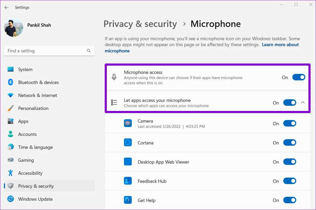4. Scroll down and toggle on Let apps access your microphone, ensuring specific apps like Zoom or Teams have permission.