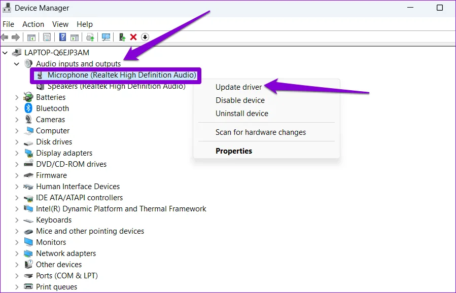 2. Right-click your microphone and select Update driver. Choose Search automatically for drivers.