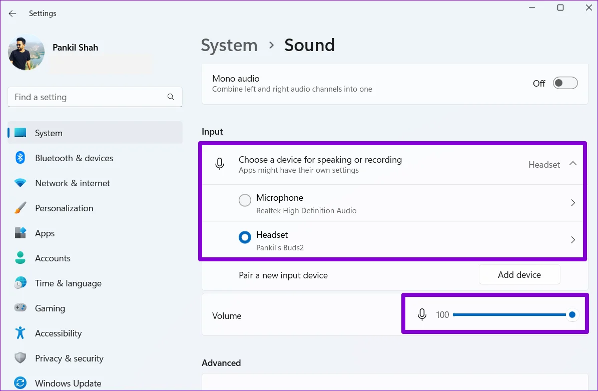 • Check the Connection: Ensure your external mic is plugged in securely. If your PC has separate audio jacks, make sure it is in the input (pink) port, not the output. For USB mics, try switching to a different USB port.