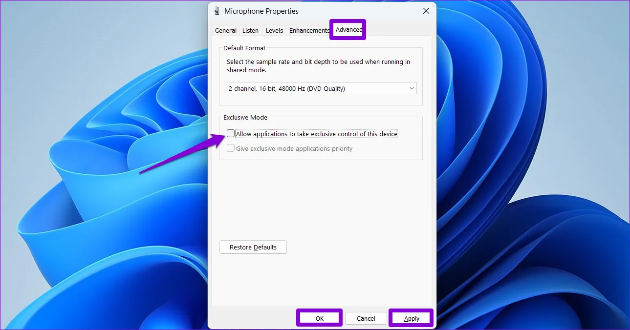 4. Go to the Advanced tab and uncheck Allow applications to take exclusive control of this device.